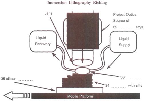 A technology called immersion lithography might be the solution. Although liquids are not commonly associated with computers, a tiny drop of water may be all it takes to make microprocessors smaller and more powerful. Intel and IBM, who made the first microprocessors, have recently developed a unique method of microchip production, which uses water droplets to enable manufacturers to shrink the chips —and at a reasonable price! The new microchip is produced by using a drop of water to narrow the gap between the light source and the etching mask, and shorten the wavelength of the UV light to less than 34 ran. This process can be used to manufacture microchips as small as 45 ran, or possibly even smaller.