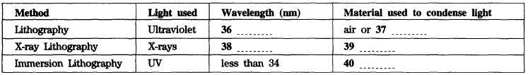 However, lithographic etching is unable to make chips much smaller-than 65 ran due to the fundamental properties of light. If the slit in the mask were made narrower, the air and nitrogen used in the space between the lens and the etching mask would diffuse the light, causing a blurred image. This means that 193-nm UV light cannot be used to produce microchips with features smaller than 65 ran. Manufacturers know that they need to go even smaller for the technological demands of this century, and they are looking for new methods of making microchips.